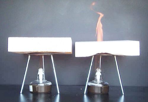 試験方法 アルコールランプ燃焼試験(社内試験) 断熱材表面に照射させる温度:約630℃ アルコールランプからの距離:約55mm 試験時間:約10分間 試験片数:各2 |