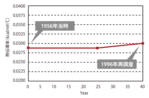 熱伝導率測定は、JIS A 1412(保温材の熱伝導率測定法)に準じて行われ、創建当時からの熱伝導率の変化はほとんど見られなかった。 セルの状態も観察したが、異常はなかった。